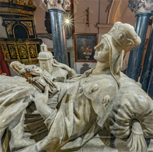 Na cokole, między 14 kolumnami z czarnego marmuru, znajduje się właściwy sarkofag, a na jego tumbie spoczywa św. Jadwiga z głową lekko podniesioną ku ołtarzowi. W prawej ręce trzyma dość spory model bazyliki. Jest to rzeźba z białego, silnie polerowanego