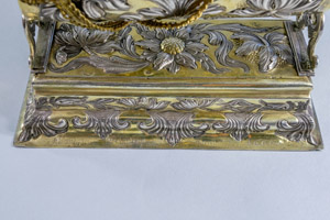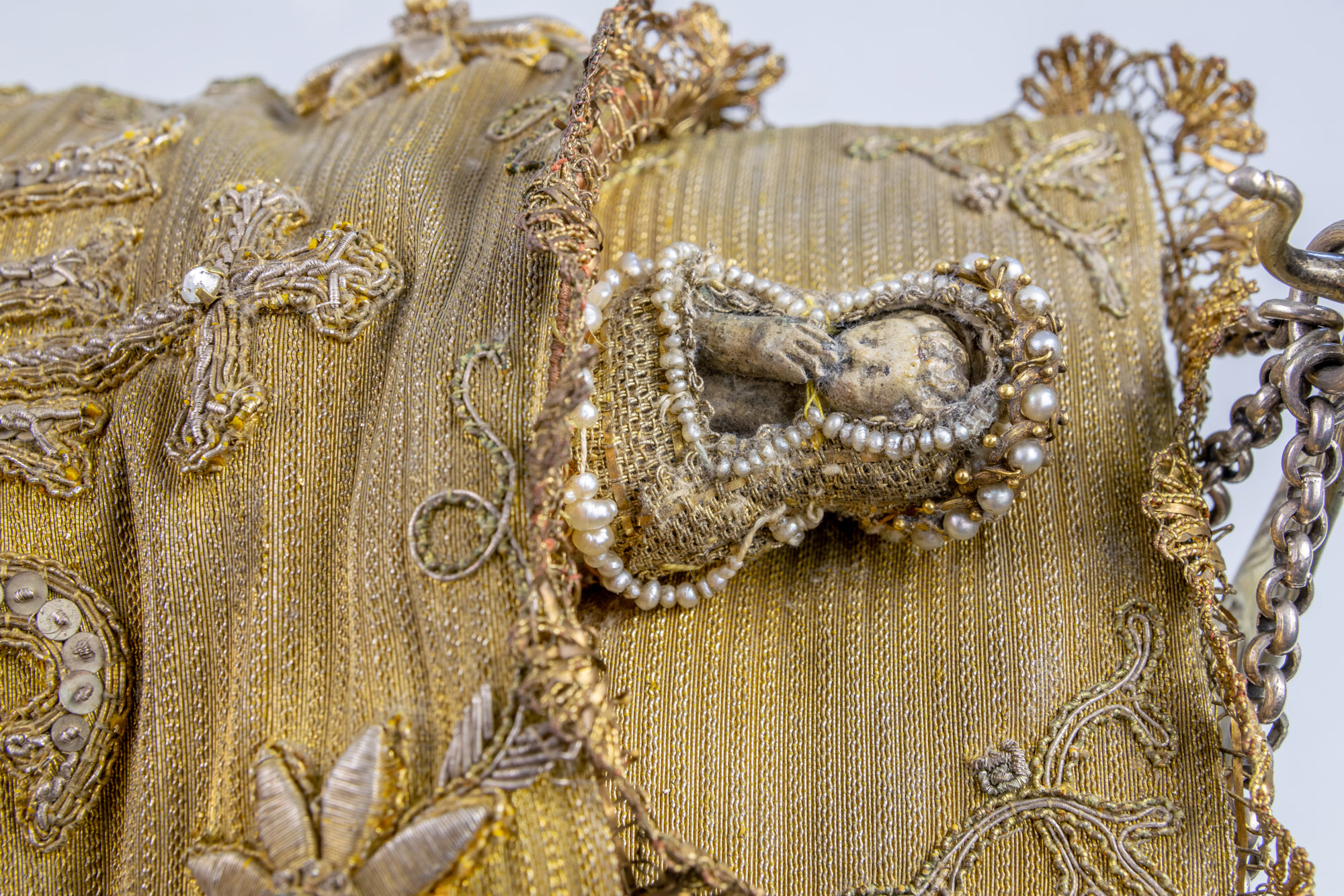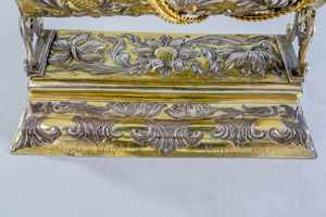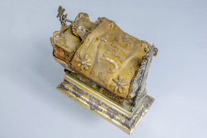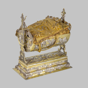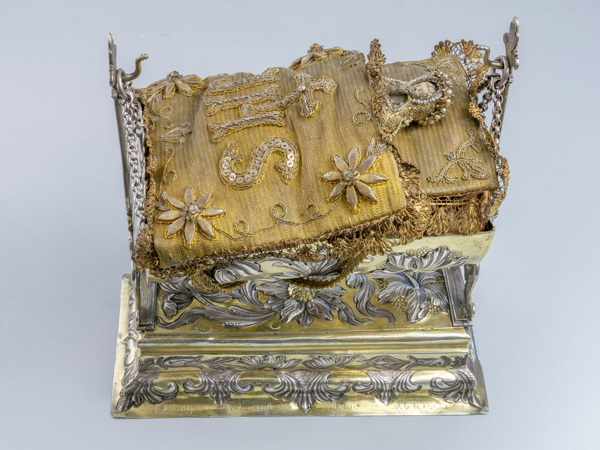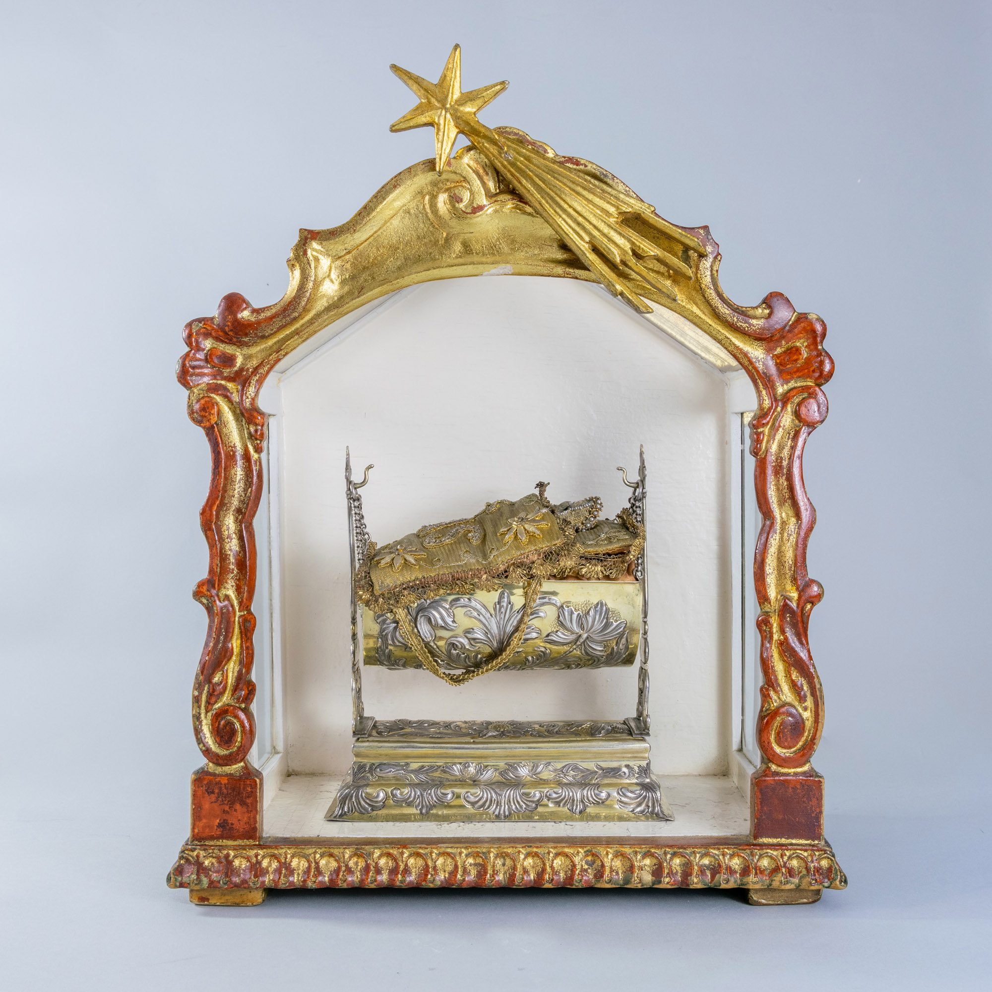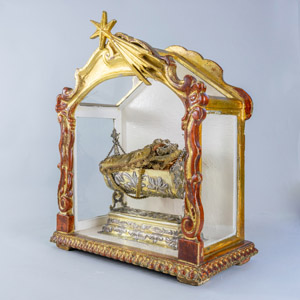 Srebrna, pozłacana kołyska z Dzięciątkiem Jezus